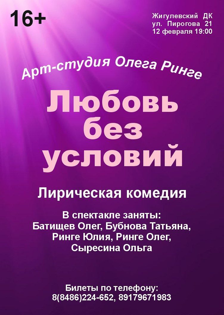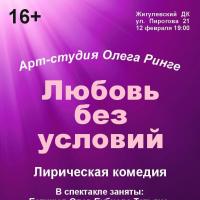Арт-студия Олега Ринге, в преддверии Дня влюблённых, приглашает вас нас лирическую комедию "Любовь без условий". Двадцать лет совместной жизни, размеренный быт, дети выросли и улетели из родительского гнезда, страсти давно позади, на работе "творческий кризис" .... Что или кто может внести новые краски, новые эмоции в этот скучный мир?