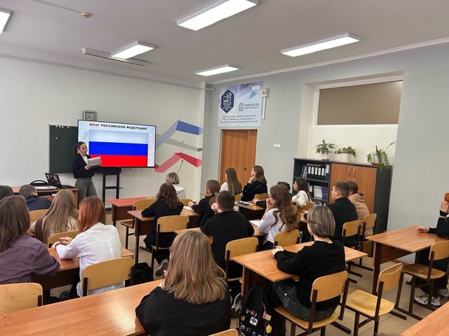 Она познакомила учеников с понятиями "Конституция РФ, закон, право, обязанность", напомнила семиклассникам значение государственной символики: флага, герба, гимна.