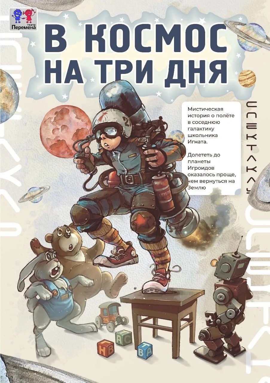 Спектакль о путешествии школьника в соседнюю галактику. Цель спектакля: показать, что в самых сложных жизненных ситуациях надо искать выход, а так-же уметь оценивать людей по их поступкам, а не по словам. Сюжет спектакля: Школьника Игната от класса посылают на планету Игроидов в экспедицию за несколькими экземплярами обитателей этой планеты. Так на корабле оказываются два инопланетных существа. Но их поведение оказалось не безобидным. Земля под угрозой заражения. Против Игната применяется хитрость, обман, подлость… И даже связь с Землёй оказалась повреждена… Выход кроется только в характере мальчика.